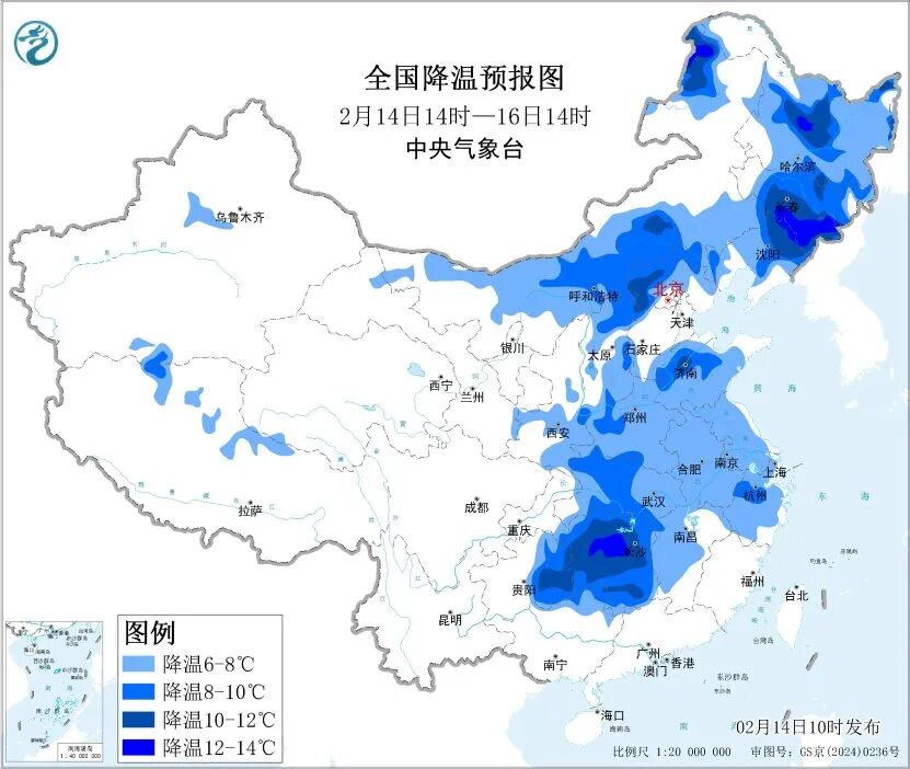 受寒潮影响,预计2月14日至16日,我国中东部大部地区气温将自北向南下降6℃至10℃,内蒙古中部、东北地区中东部、黄淮西部、江汉北部、江南中西部等地下降10℃至12℃,局地降温可达14℃以上。长江中下游以北部分地区将有4至5级偏北风,阵风6至8级。